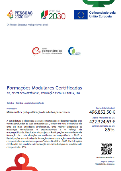 Este projeto valoriza o potencial humano, impulsionando a empregabilidade e contribuindo para o desenvolvimento de uma sociedade mais inclusiva e qualificada. Alinhado com o objetivo de reforçar a coesão social, aposta no crescimento sustentável e na igualdade de oportunidades para todos.